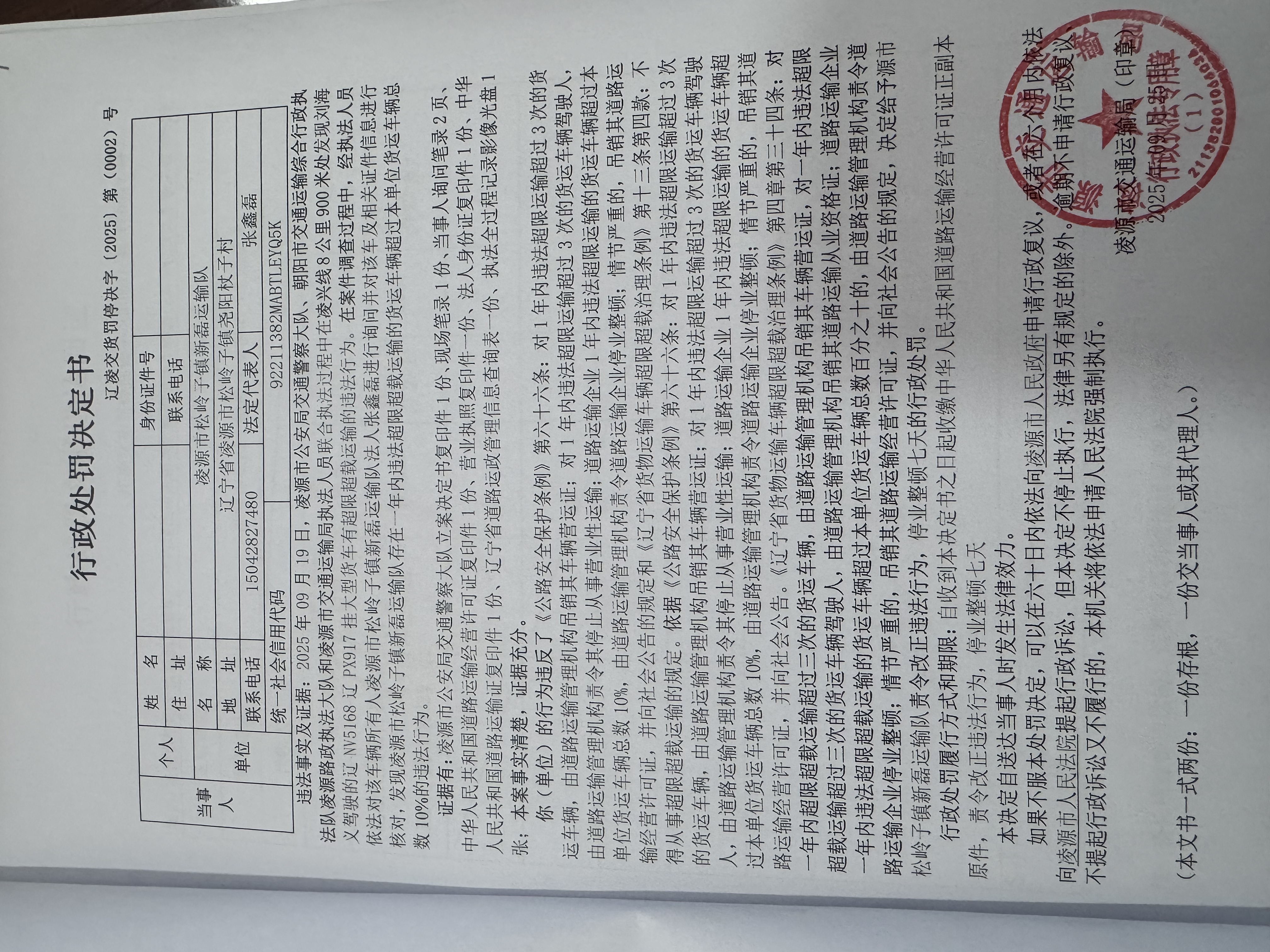 【凌源交通】行政处罚决定书